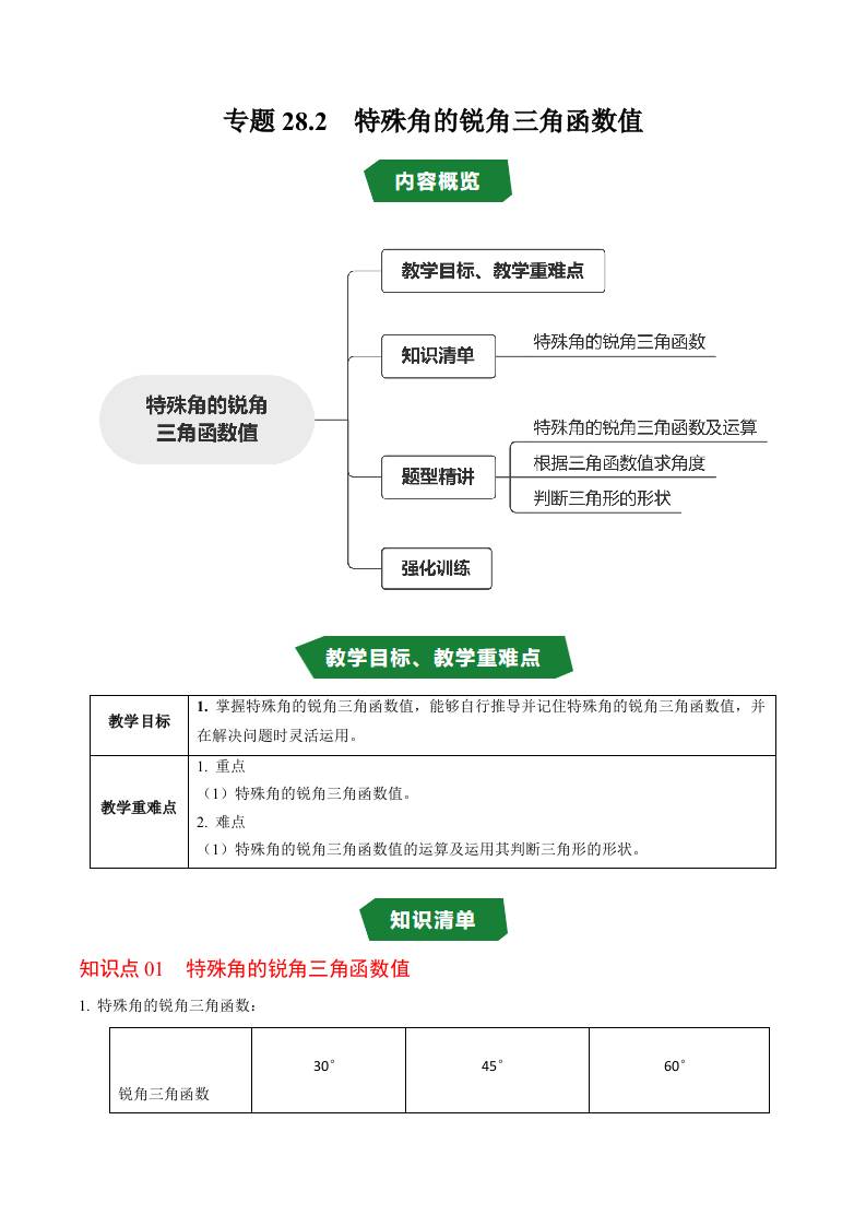 专题28.2 特殊角的锐角三角函数值(高效培优讲义)(解析版)