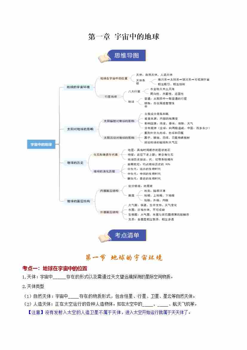 第一章《宇宙中的地球》(期末复习知识清单)(填空版)