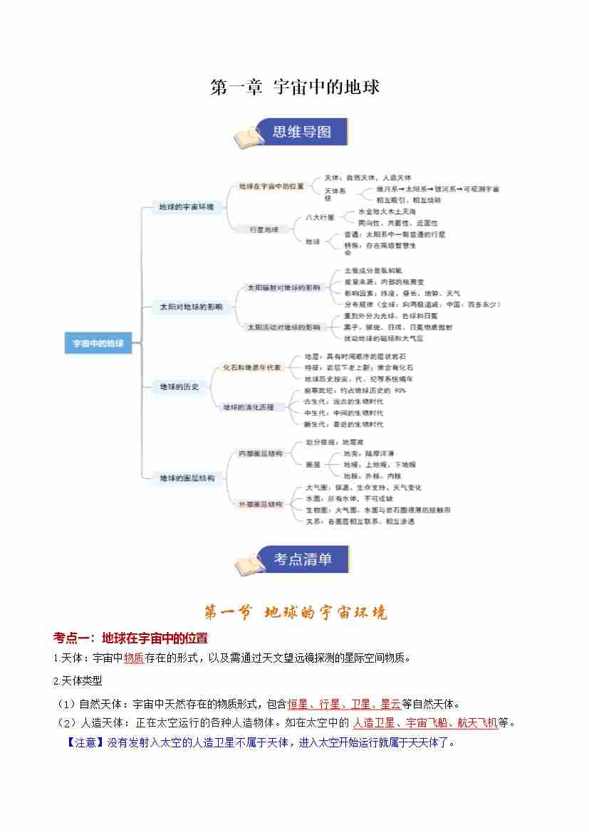 第一章《宇宙中的地球》(期末复习知识清单)(教师版)