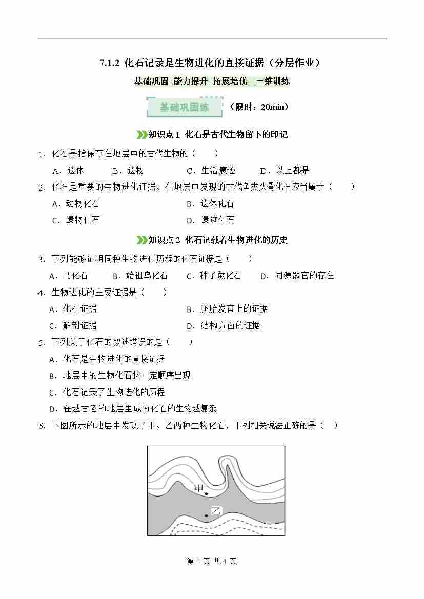 7.1.2 化石记录是生物进化的直接证据(分层作业)(原卷版)