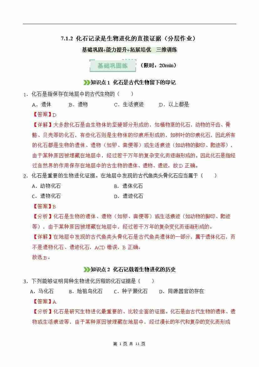 7.1.2 化石记录是生物进化的直接证据(分层作业)(解析版)