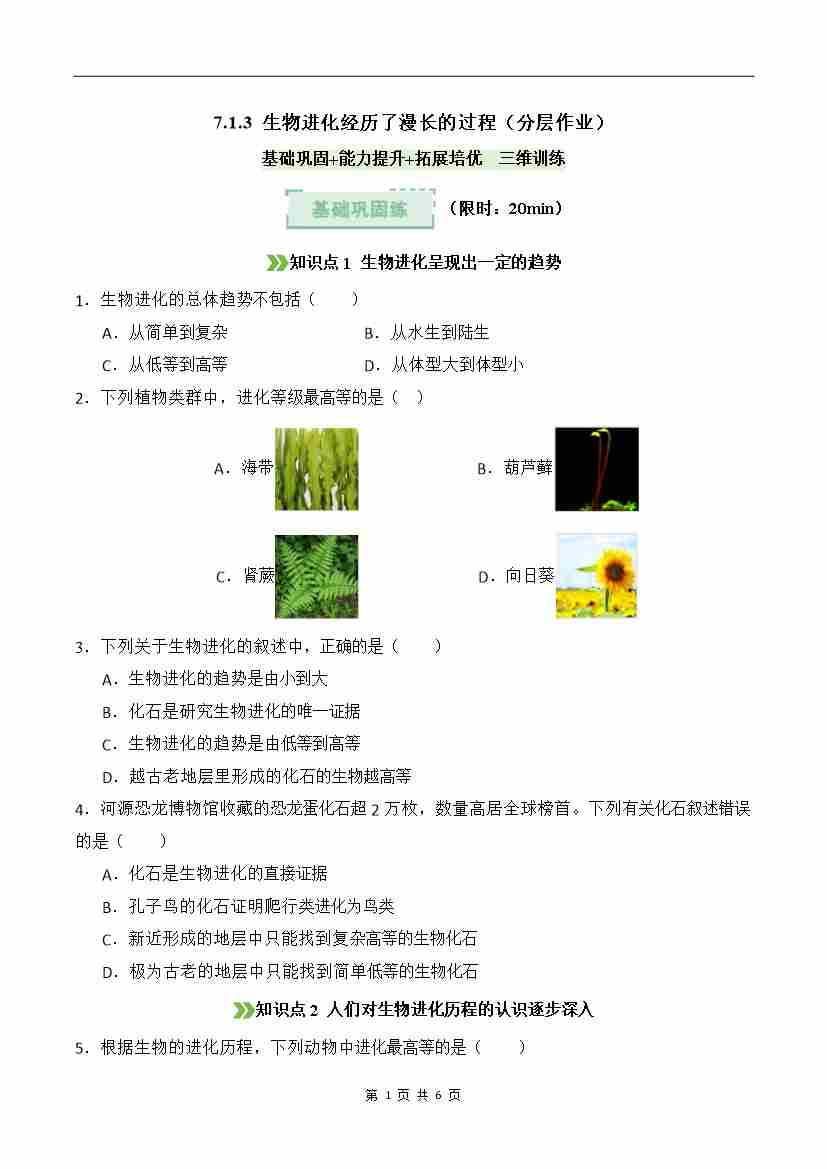 7.1.3 生物进化经历了漫长的过程(分层作业)(原卷版)