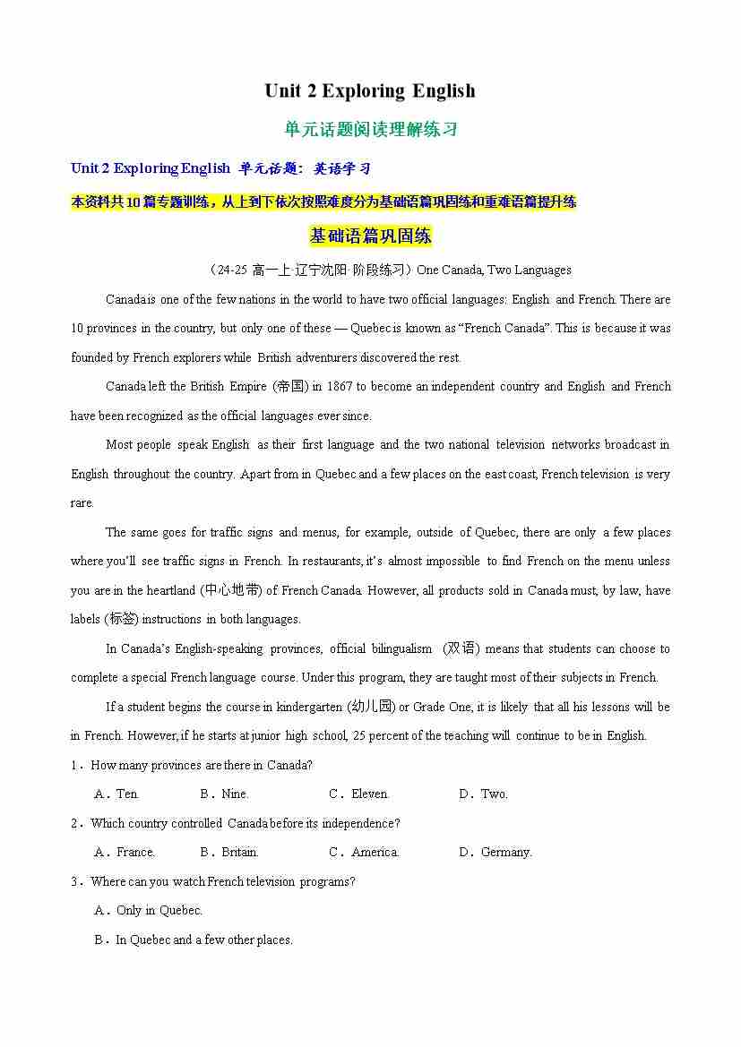 Unit 2 Exploring English 单元话题阅读理解练习(学生版)