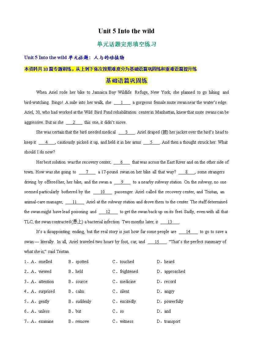 Unit 5 Into the wild单元话题完形填空练习(学生版)