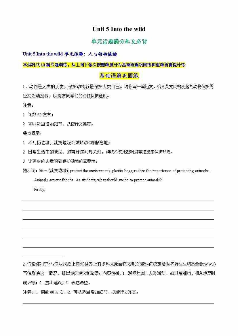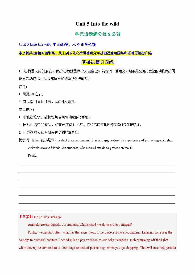 Unit 5 Into the wild单元话题满分范文必背(教师版)