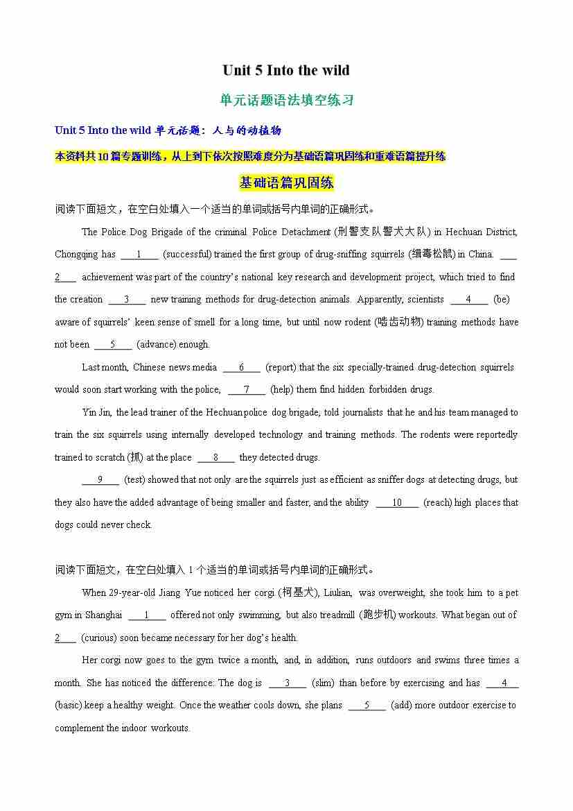 Unit 5 Into the wild单元话题语法填空练习(学生版)