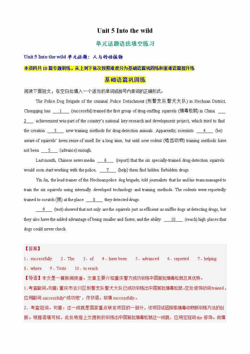 Unit 5 Into the wild单元话题语法填空练习(教师版)