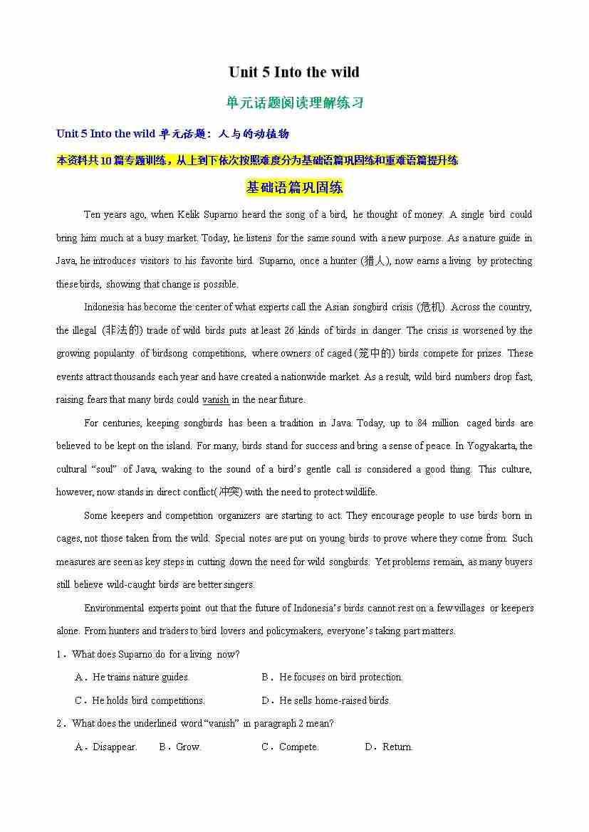 Unit 5 Into the wild单元话题阅读理解练习(学生版)