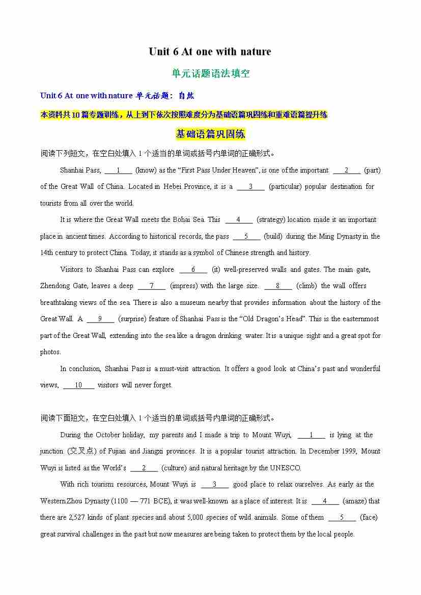 Unit 6 At one with nature单元话题语法填空练习(原卷版)
