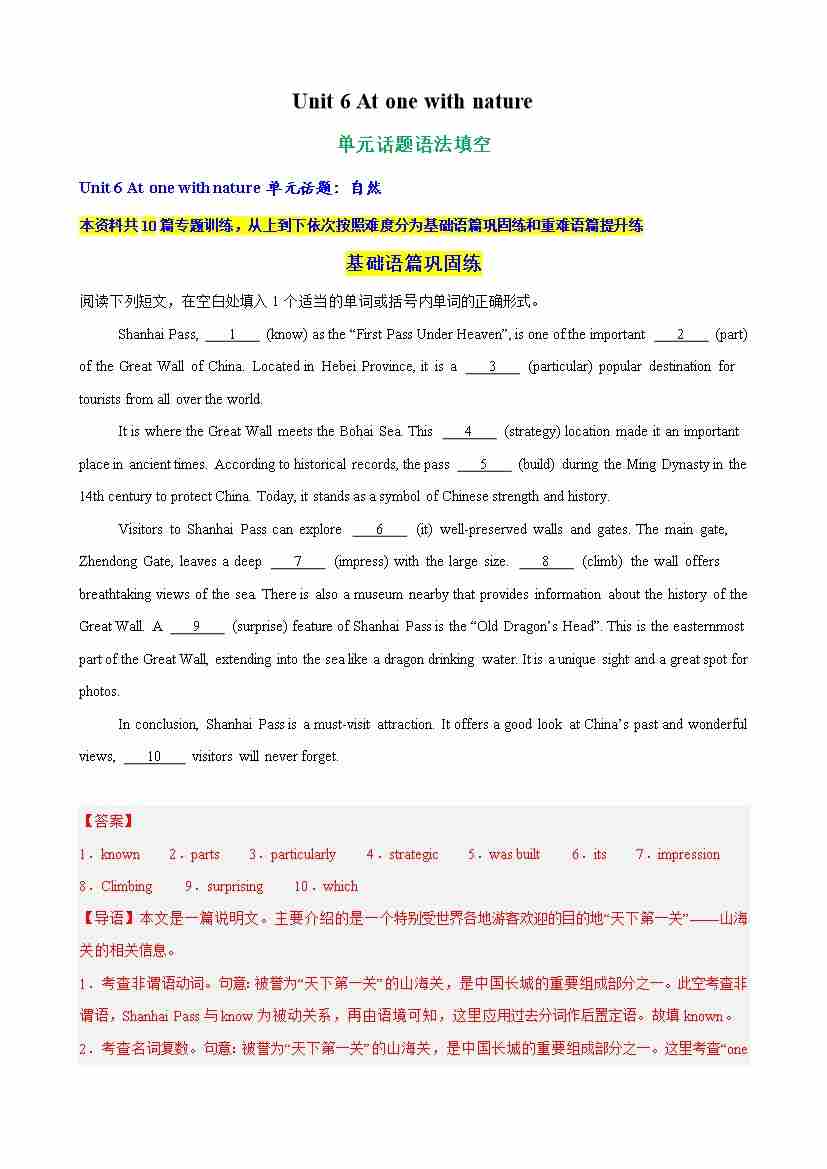 Unit 6 At one with nature单元话题语法填空练习(解析版)
