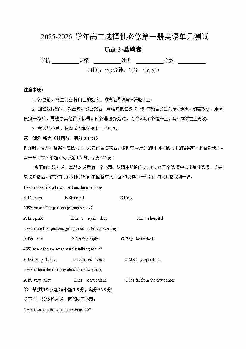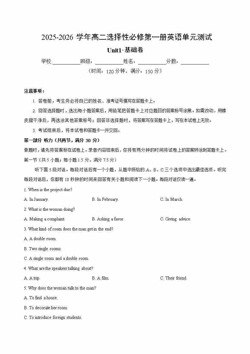 Unit 1(单元测试卷基础卷)(考试版A4)