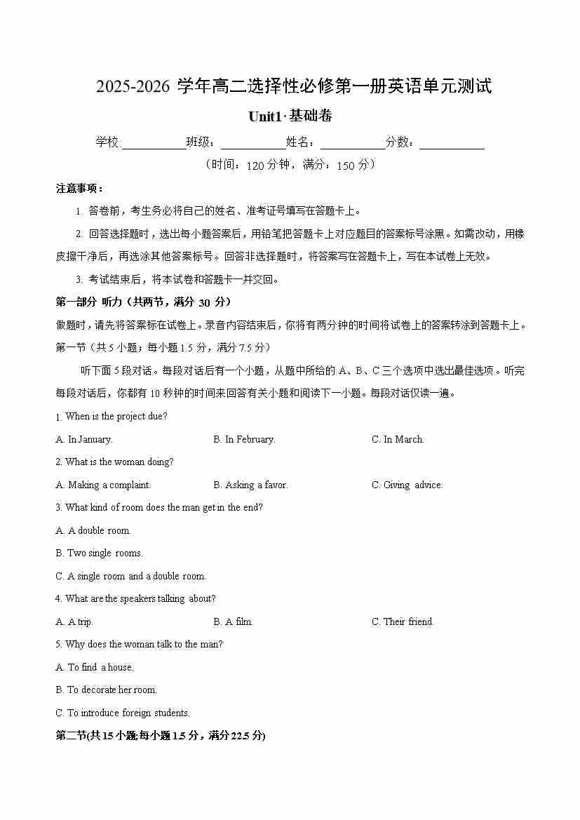 高二英语选择性必修第一册Unit 5 单元测试·基础卷(考试版A4)