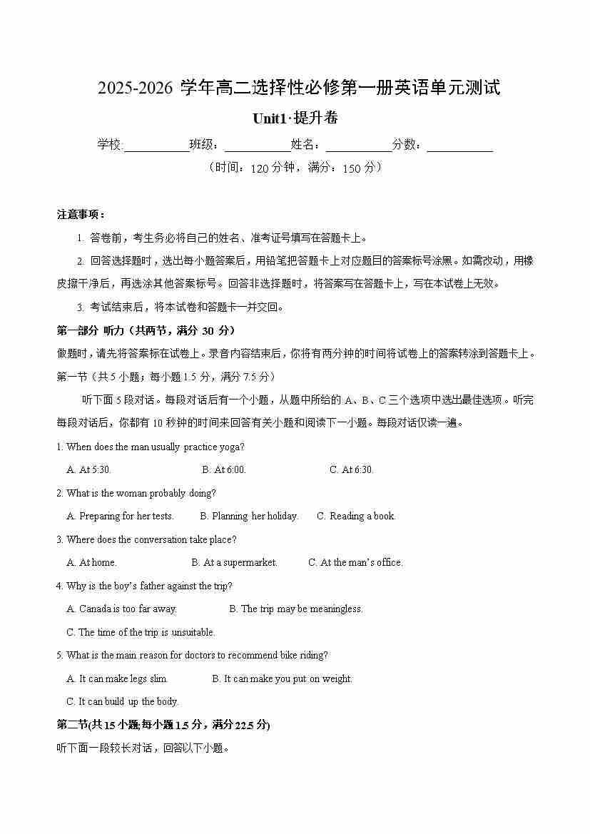 高二英语选择性必修第一册Unit 5 单元测试·提升卷(考试版A4)
