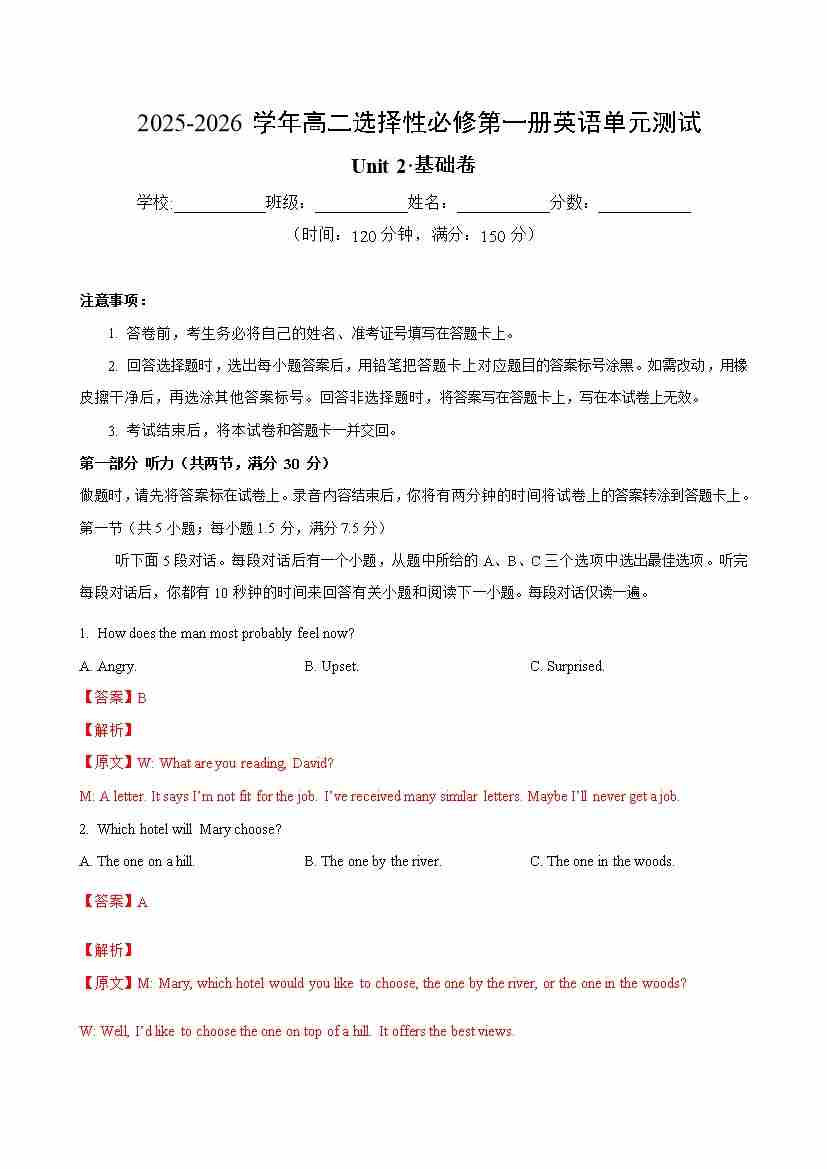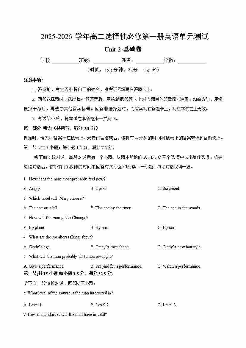 Unit 2(单元测试卷基础卷)(考试版A4)