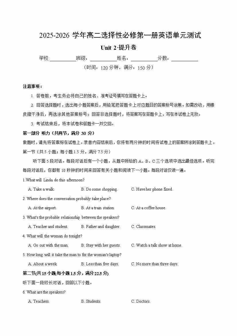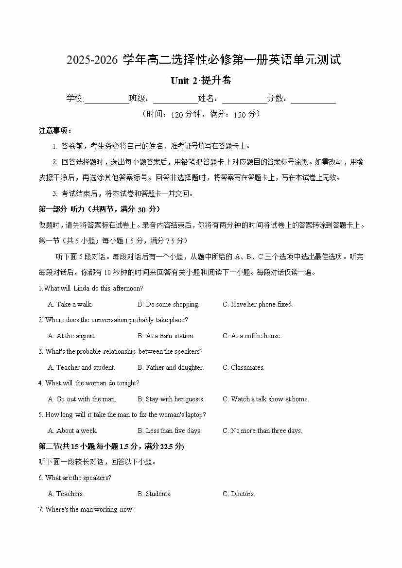 Unit 2(单元测试卷提升卷)(考试版A4)