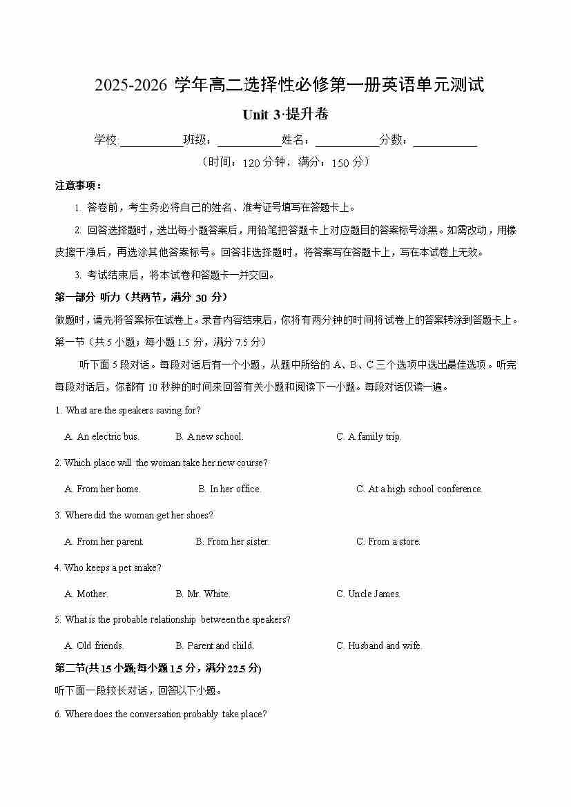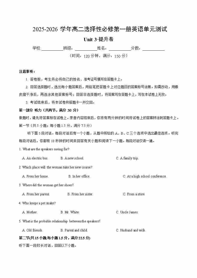 Unit 3(单元测试卷提升卷)(考试版A4)