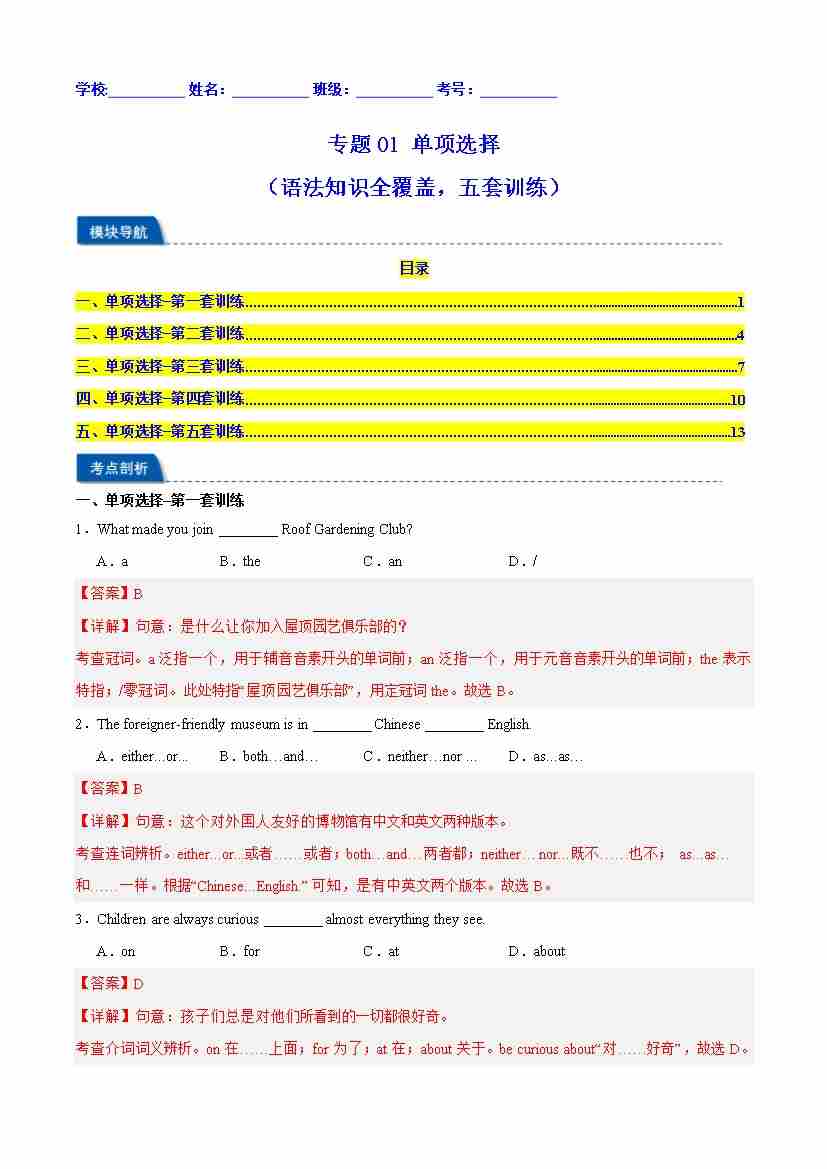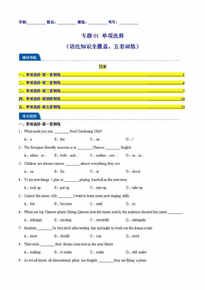 专题01 单项选择(语法知识全覆盖,五套训练)(学生版)