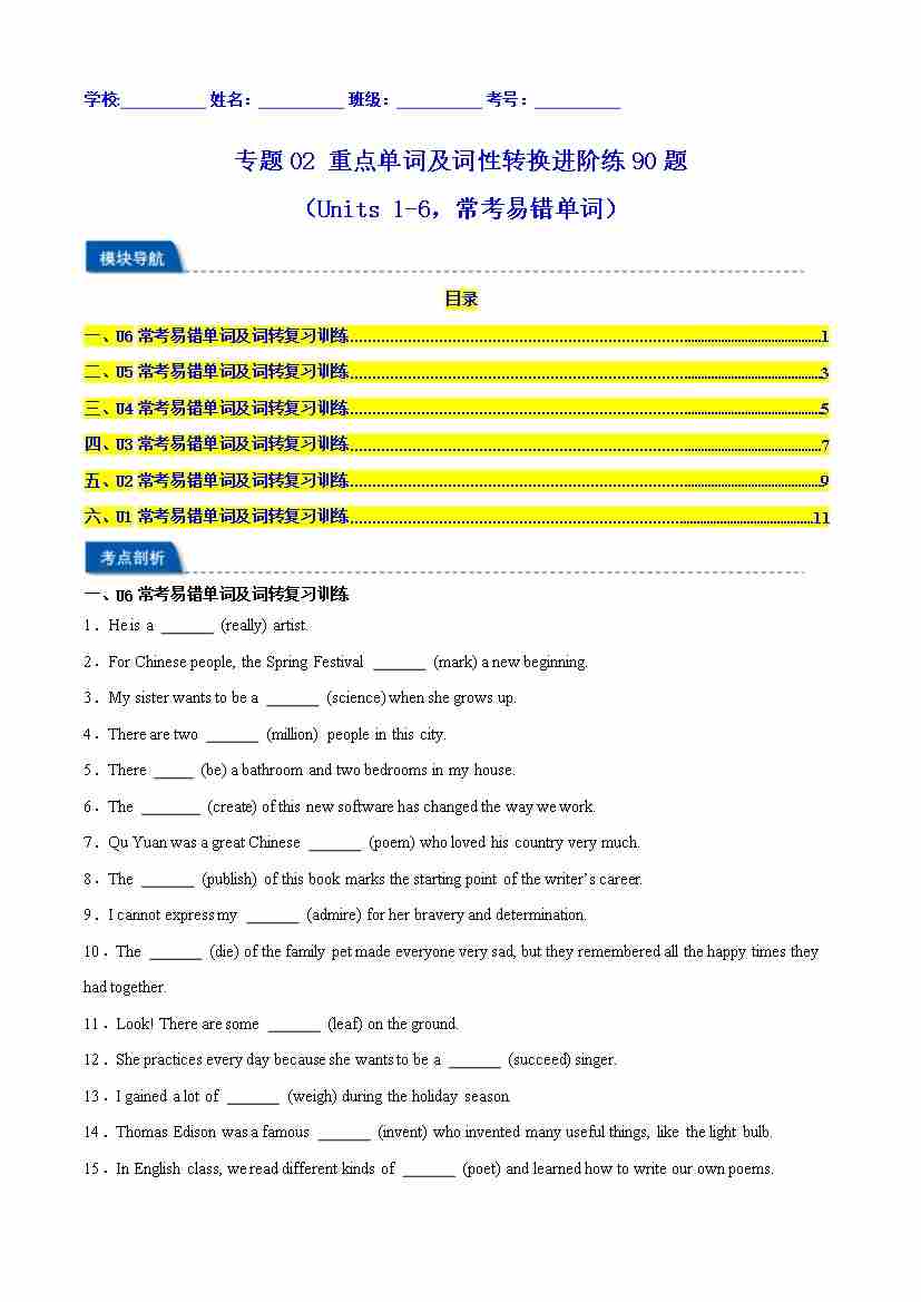 专题02 重点单词及词性转换进阶练90题(Units1-6,常考易错单词)(学生版)