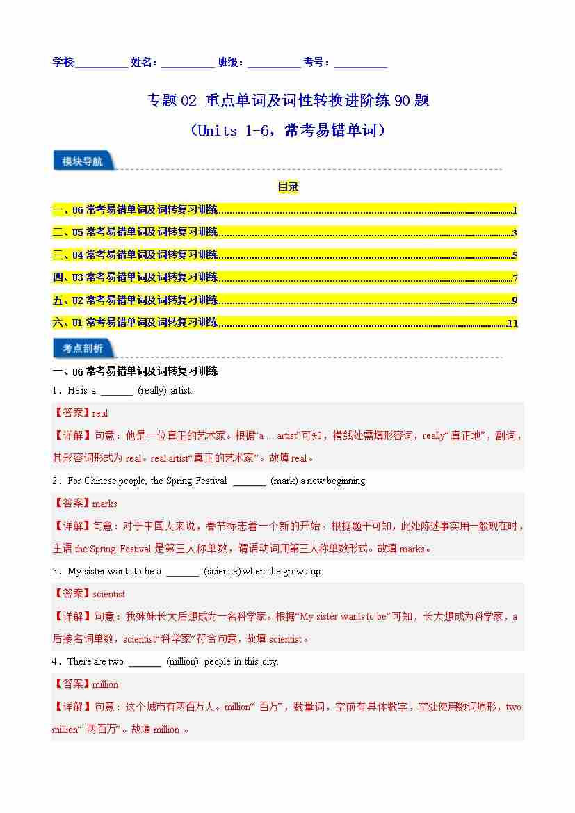 专题02 重点单词及词性转换进阶练90题(Units1-6,常考易错单词)(教师版)