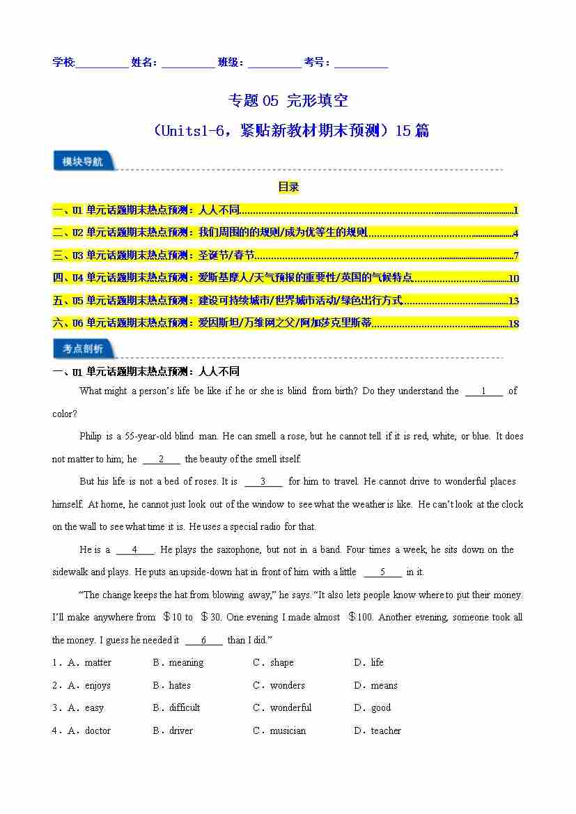 专题05 完形填空(Units1-6,紧贴新教材期末预测)15篇(教师版)