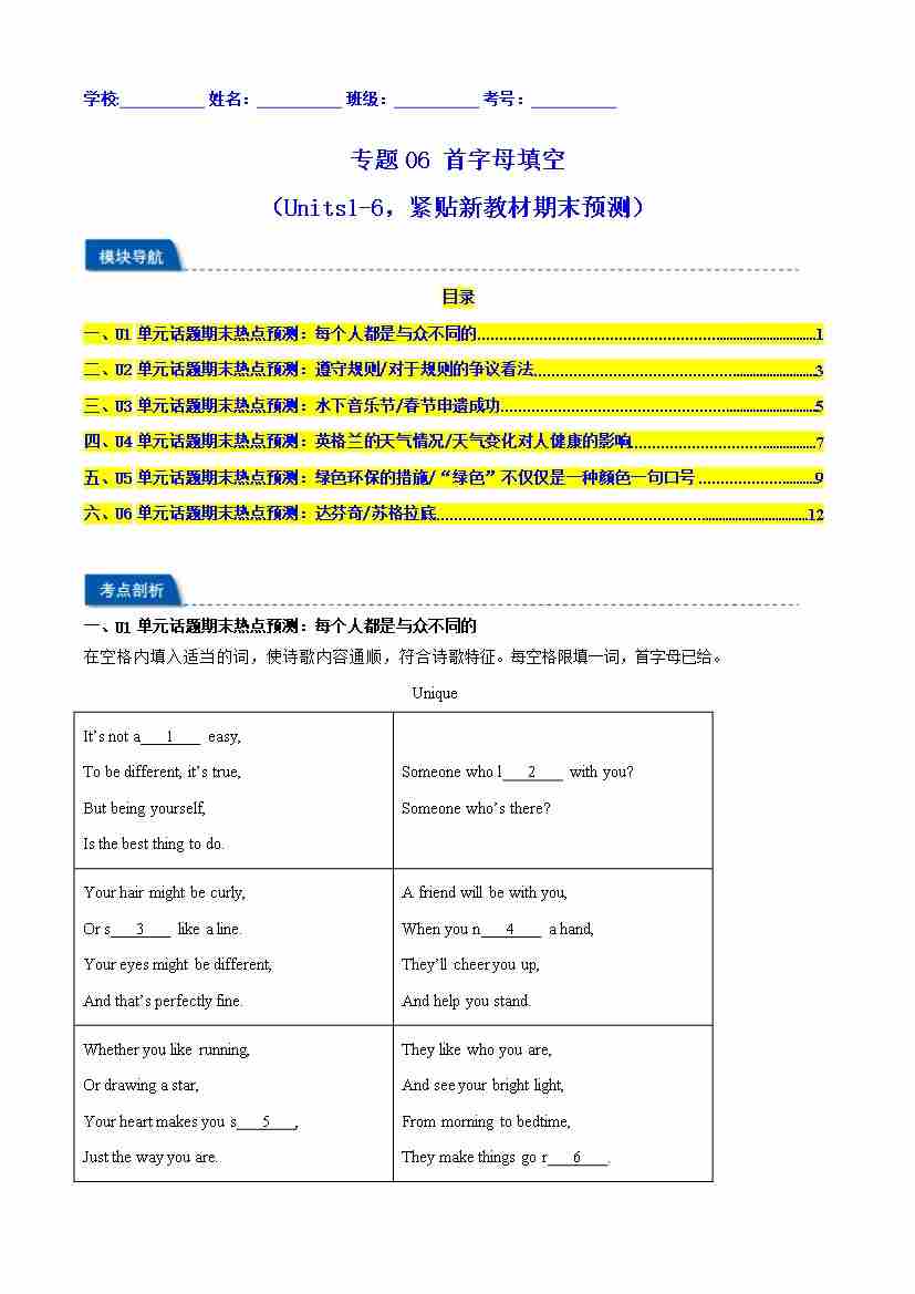 专题06 首字母填空(Units1-6,紧贴新教材期末预测)(教师版)
