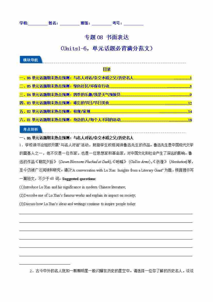 专题08 书面表达(Units1-6,单元话题必背满分范文)(学生版)