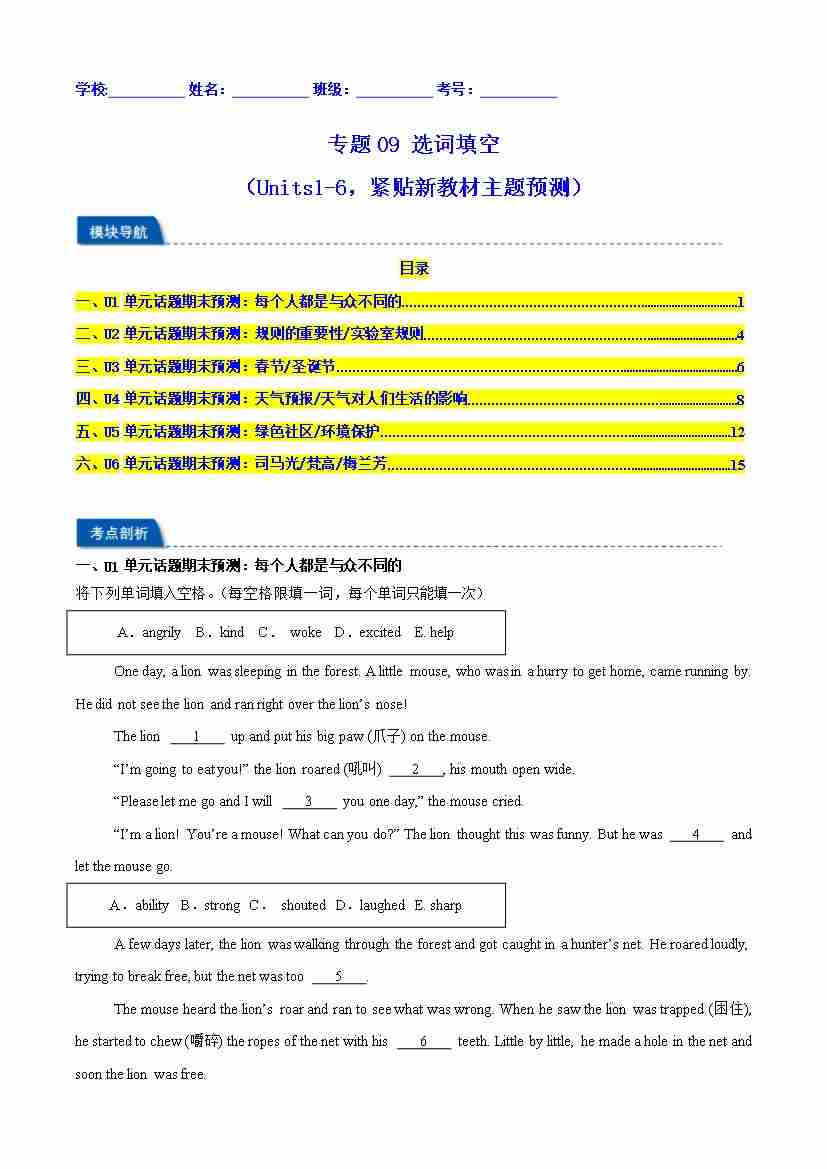 专题09 选词填空(Units1-6,紧贴新教材主题预测)(教师版)