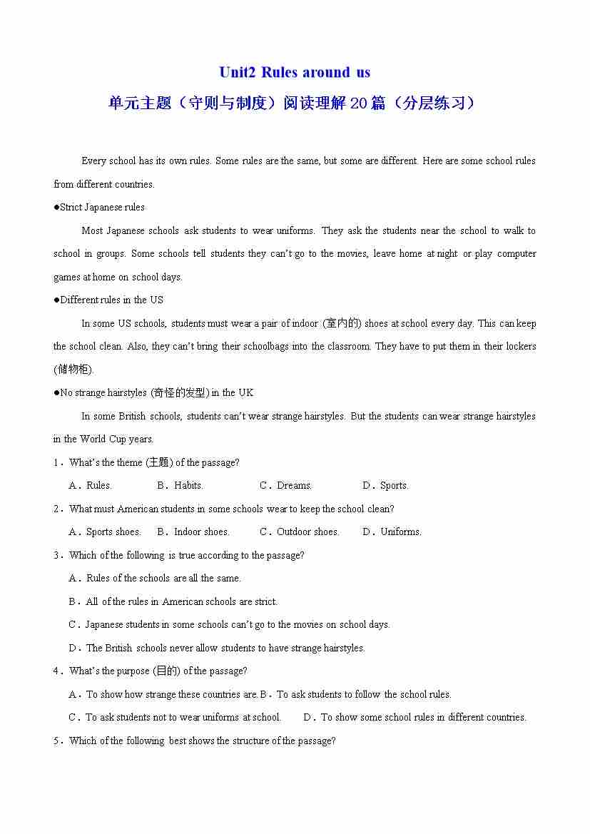 Unit2 Rules around us 单元主题(守则与制度)阅读理解20篇(分层练习)(原卷版)