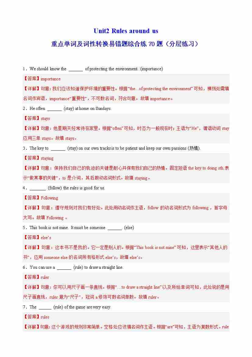 Unit2 Rules around us 重点单词及词性转换易错题综合练70题(分层练习)(解析版)
