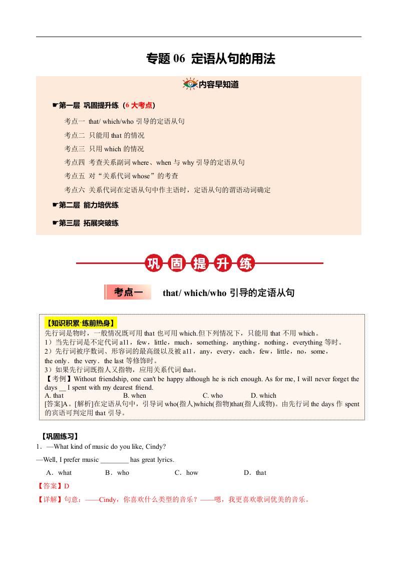 ①寒假巩固复习06 定语从句 (学生版)2025年九年级英语寒假衔接讲练 (人教版)