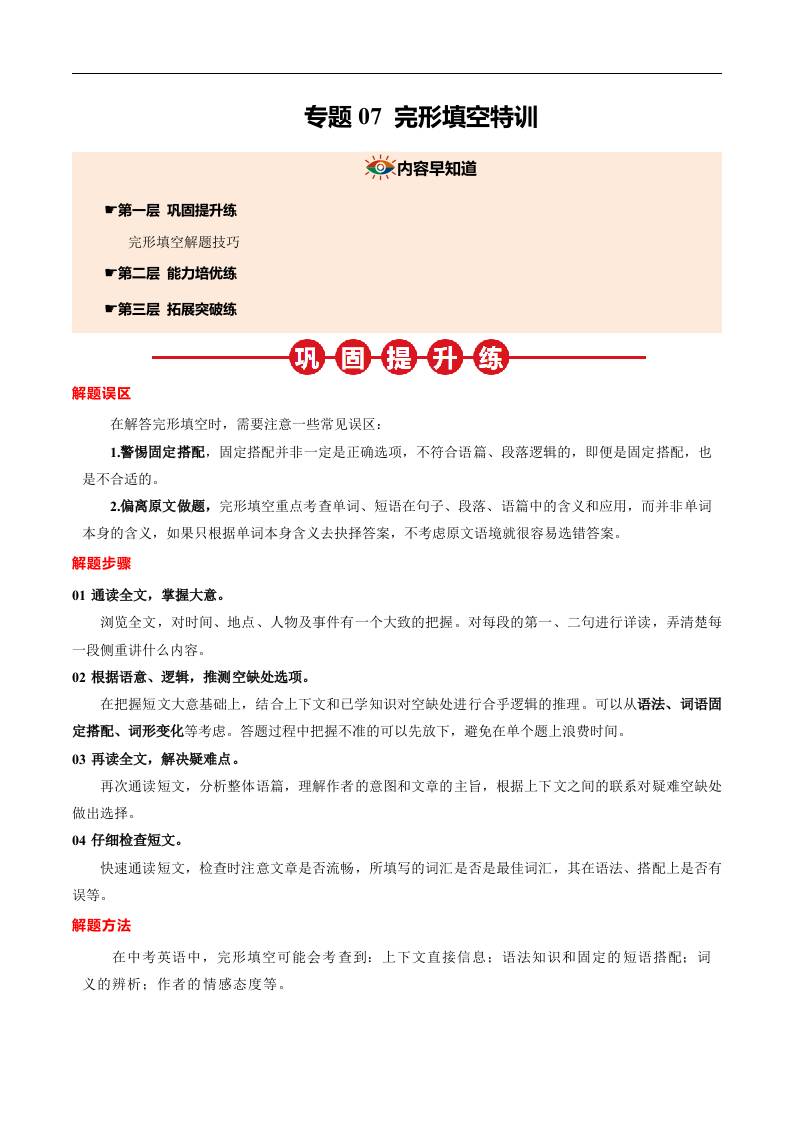 ①寒假巩固复习07 完形填空特训 (学生版)2025年九年级英语寒假衔接讲练 (人教版)