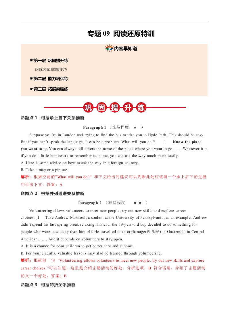 ①寒假巩固复习09 阅读还原特训 (教师版)2025年九年级英语寒假衔接讲练 (人教版)