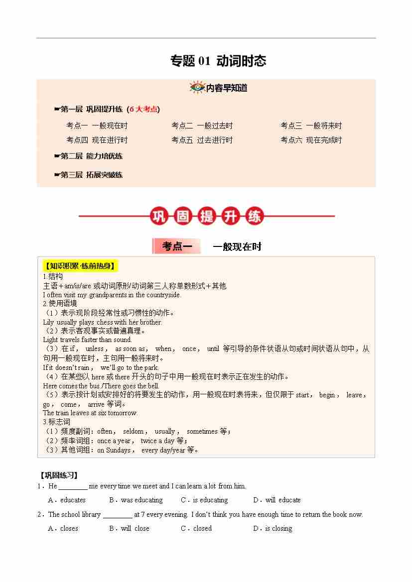 ①寒假巩固复习01 动词时态 (学生版)2025年九年级英语寒假衔接讲练 (人教版)