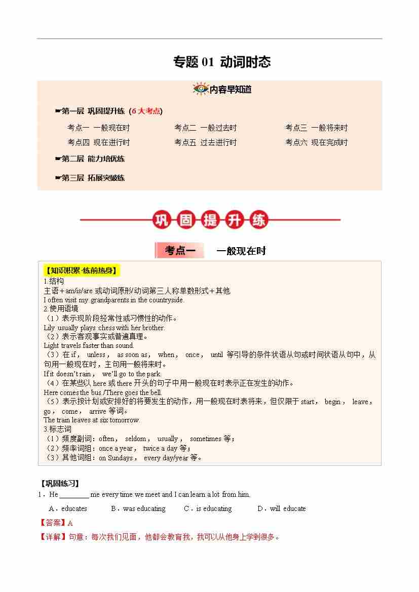 ①寒假巩固复习01 动词时态 (教师版)2025年九年级英语寒假衔接讲练 (人教版)