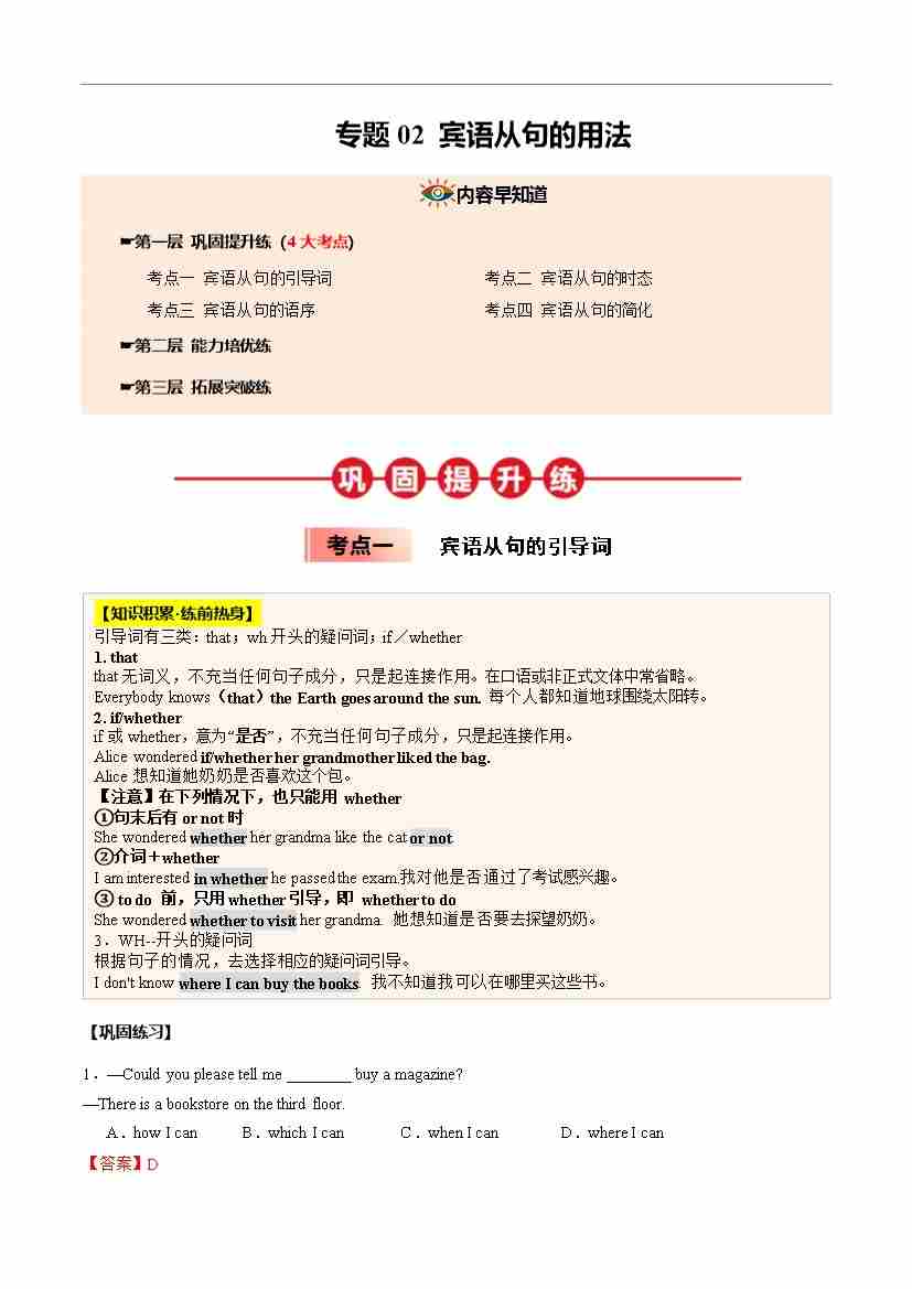 ①寒假巩固复习02 宾语从句 (学生版)2025年九年级英语寒假衔接讲练 (人教版)