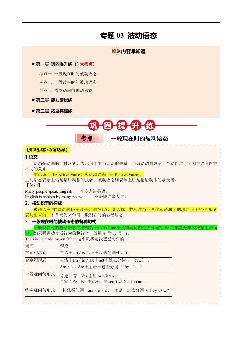 ①寒假巩固复习03 被动语态 (学生版)2025年九年级英语寒假衔接讲练 (人教版)
