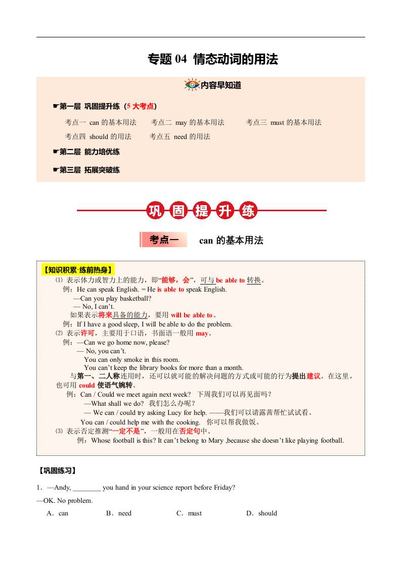 ①寒假巩固复习04 情态动词 (学生版)2025年九年级英语寒假衔接讲练 (人教版)