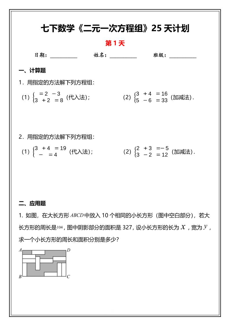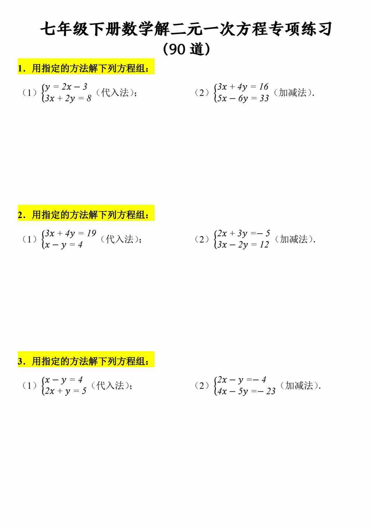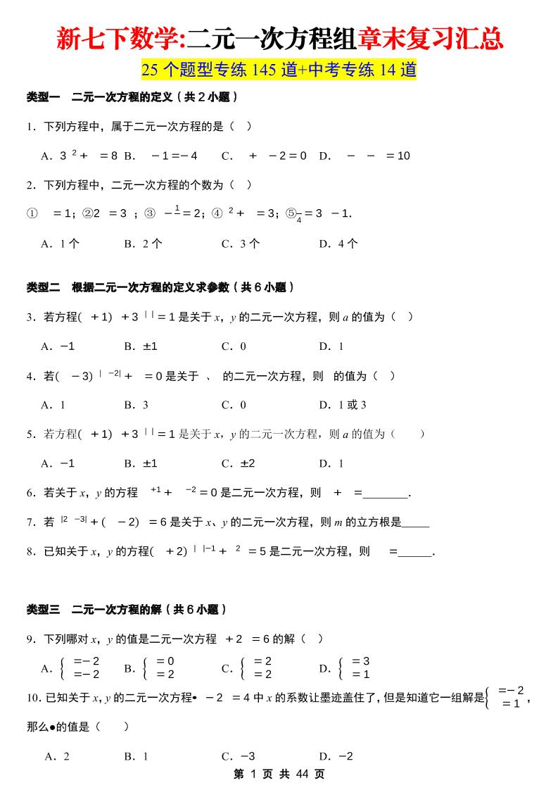 七年级下册数学二元一次方程组(25个题型专练145道中考专练14道)(原卷版)