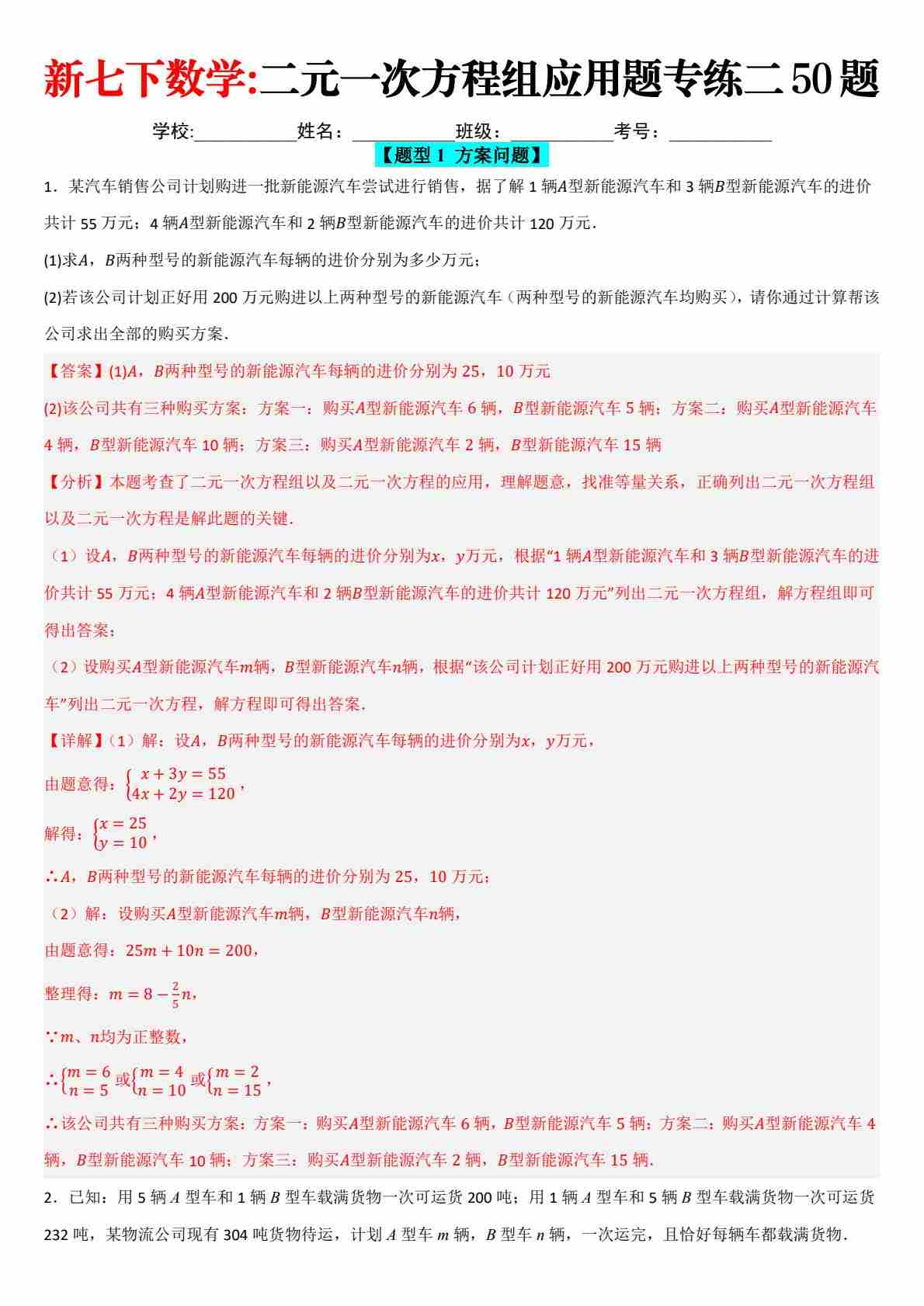 七年级下册数学二元一次方程组应用题分类训练2(解析版)