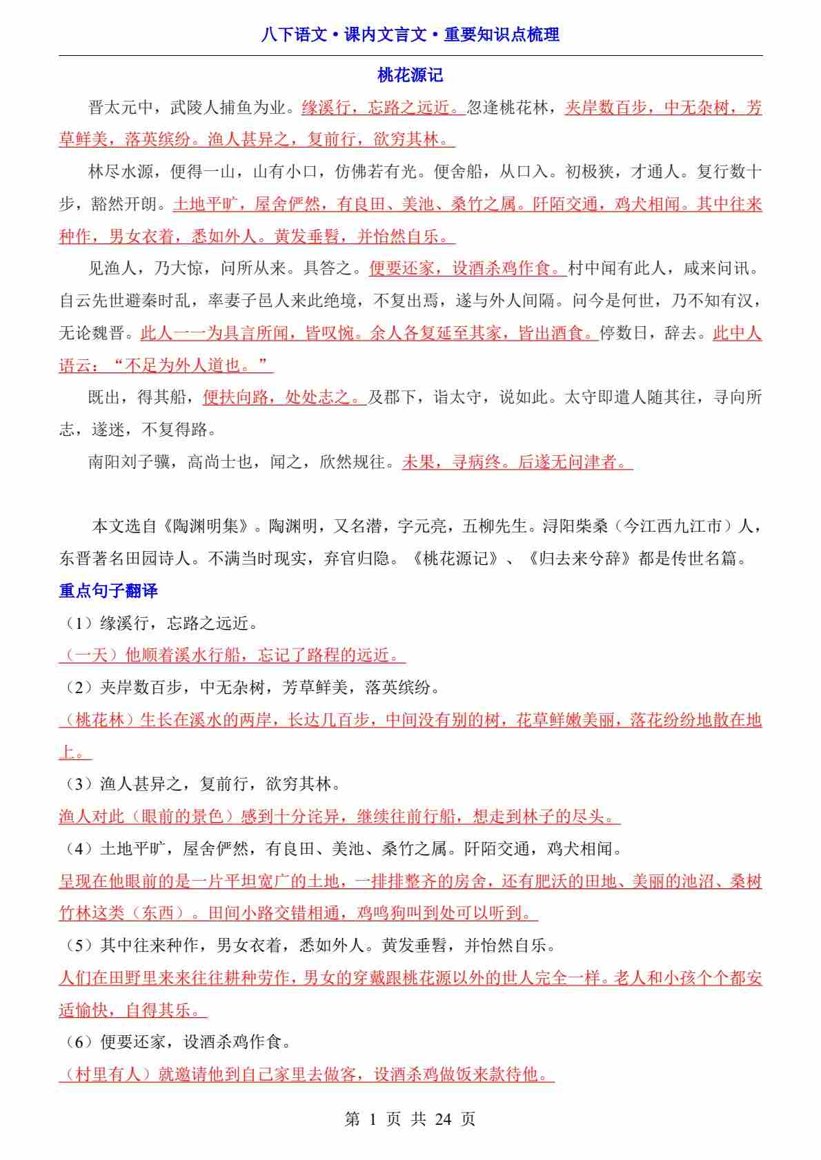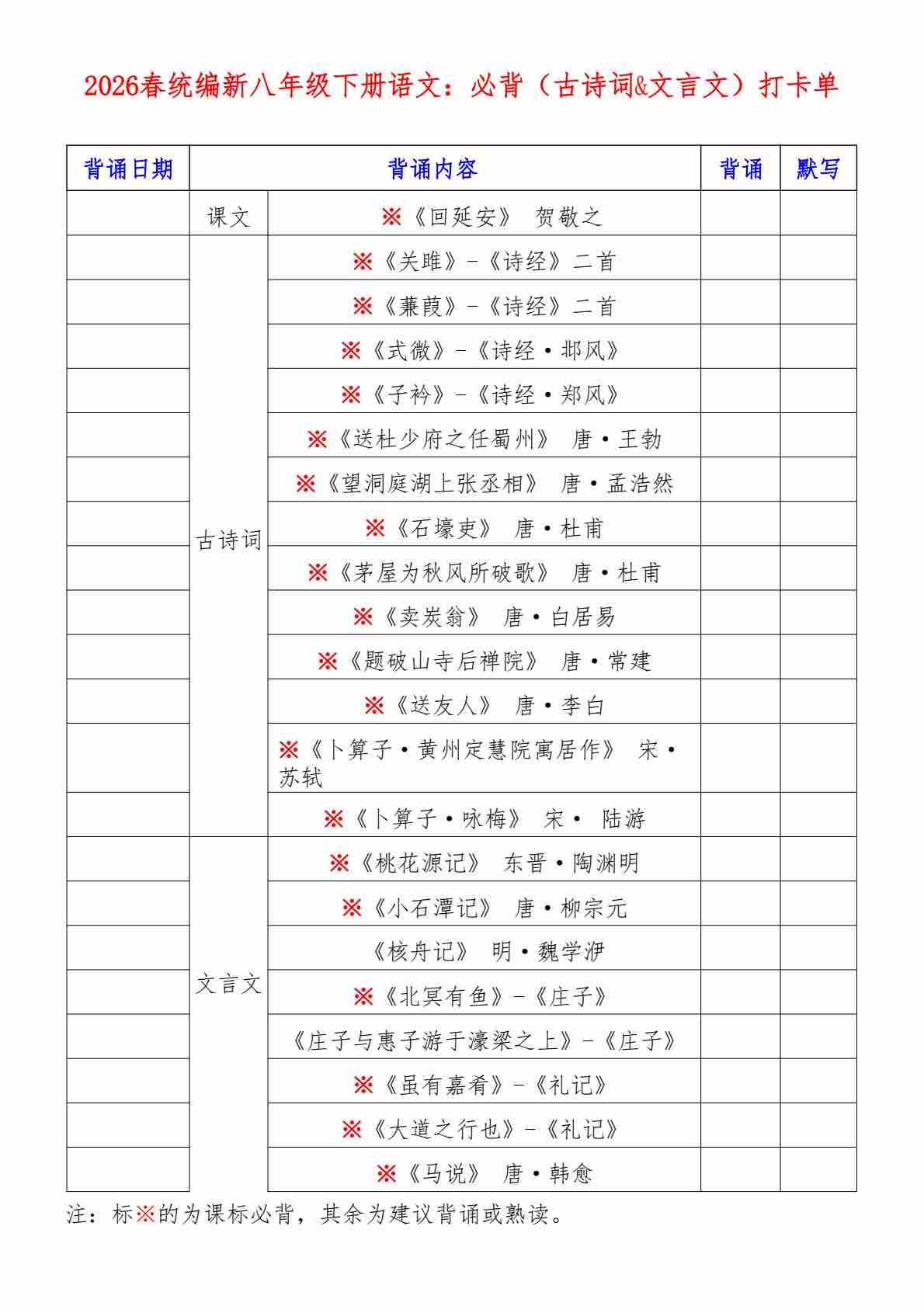 2026春新八下语文必背【古诗词&文言文】打卡单