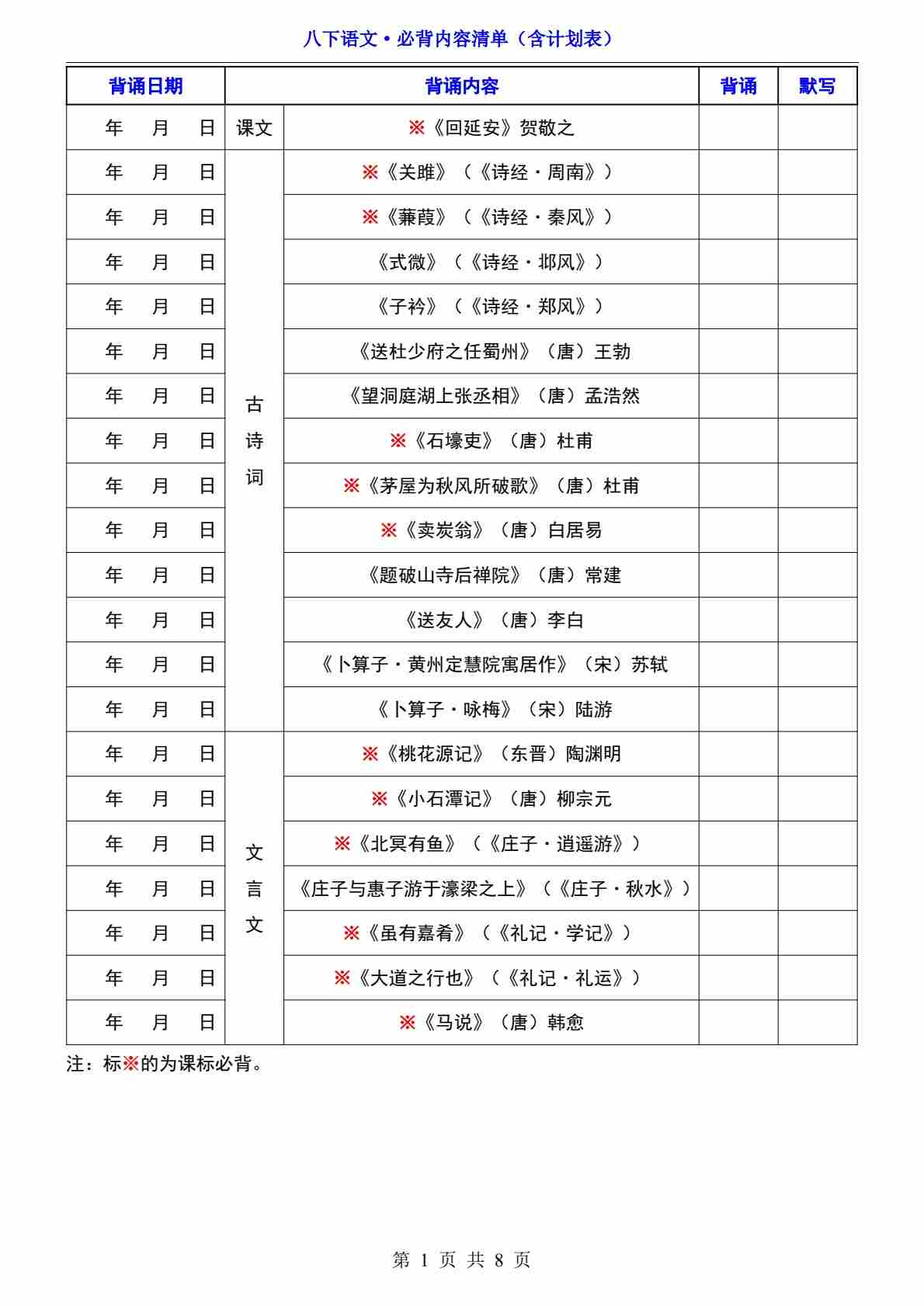 八下语文必背内容清单(含计划表)