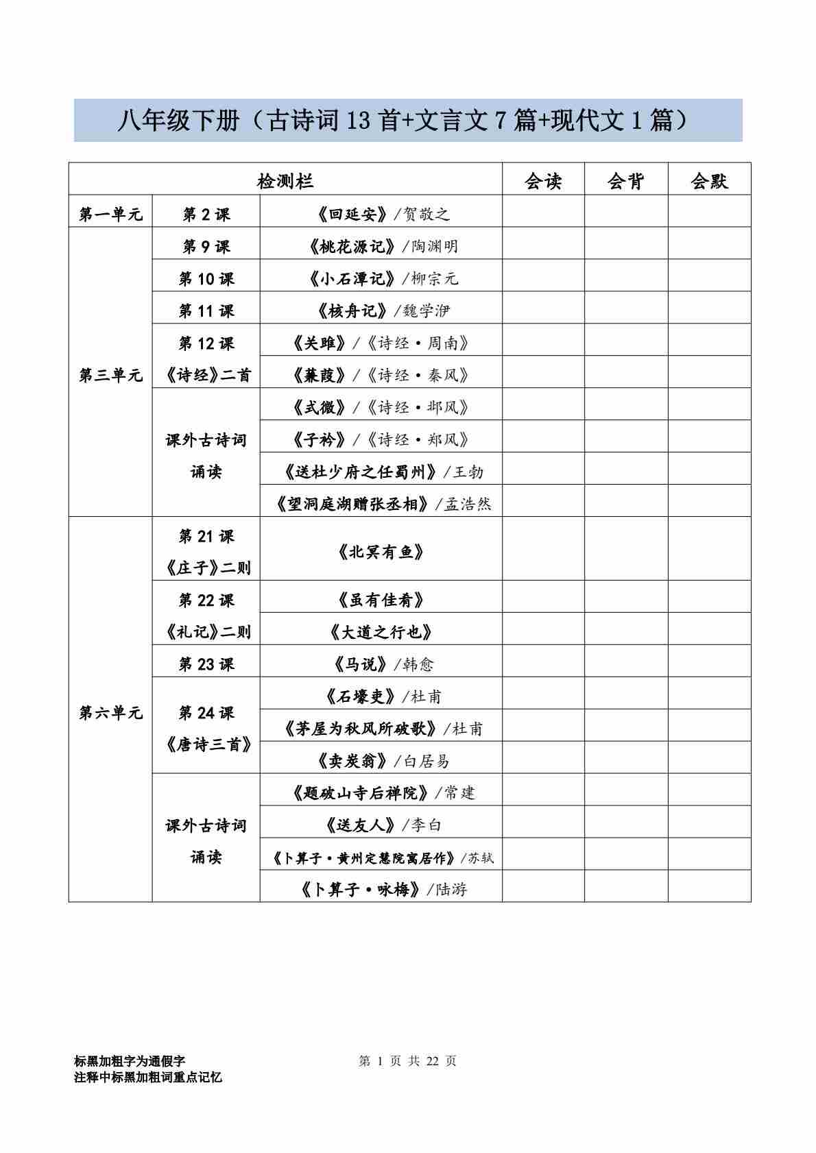 2026春新八下语文必背【古诗词&文言文】打卡单