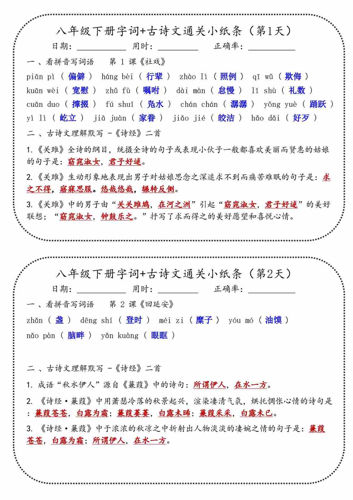 八年级下册语文【读读写写古诗文】通关默写小纸条22天-参考答案