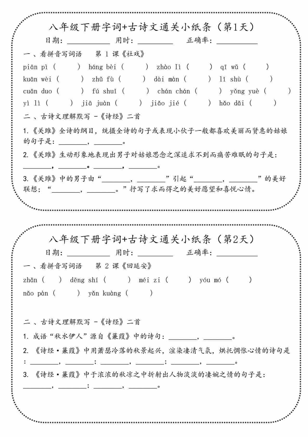八年级下册语文【读读写写古诗文】通关默写小纸条22天-学生版(2)