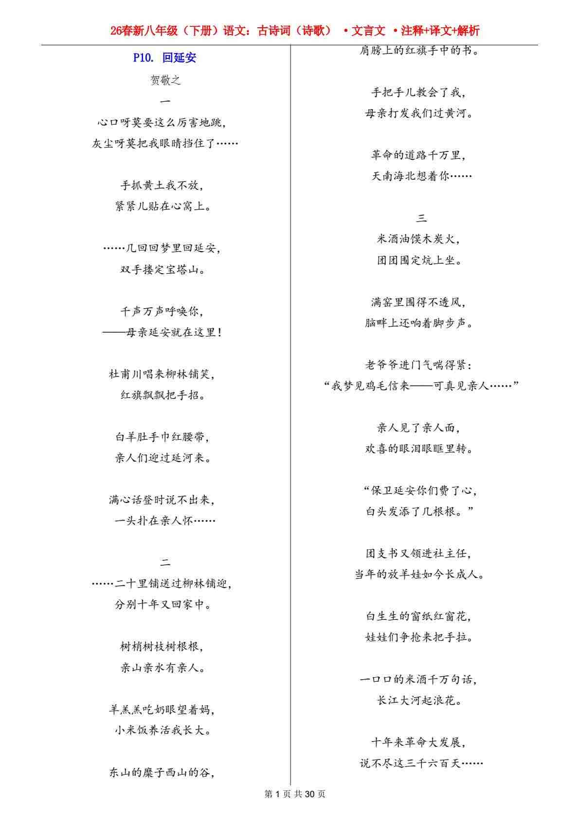 2026春新八下语文全册必背【古诗词&文言文】注释译文解析