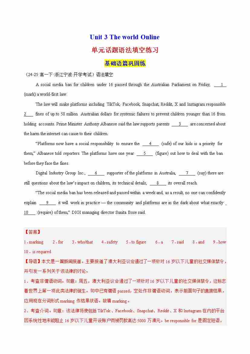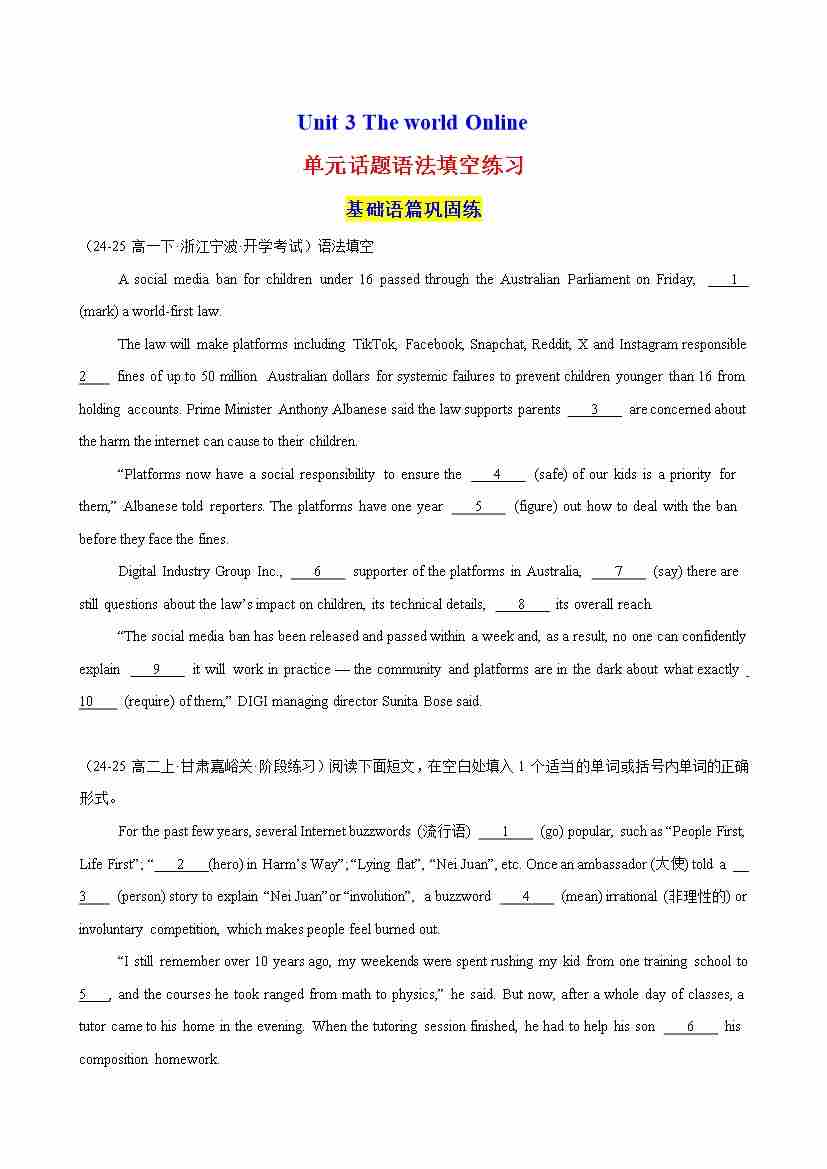 Unit 3 The world Online单元话题语法填空练习(学生版)