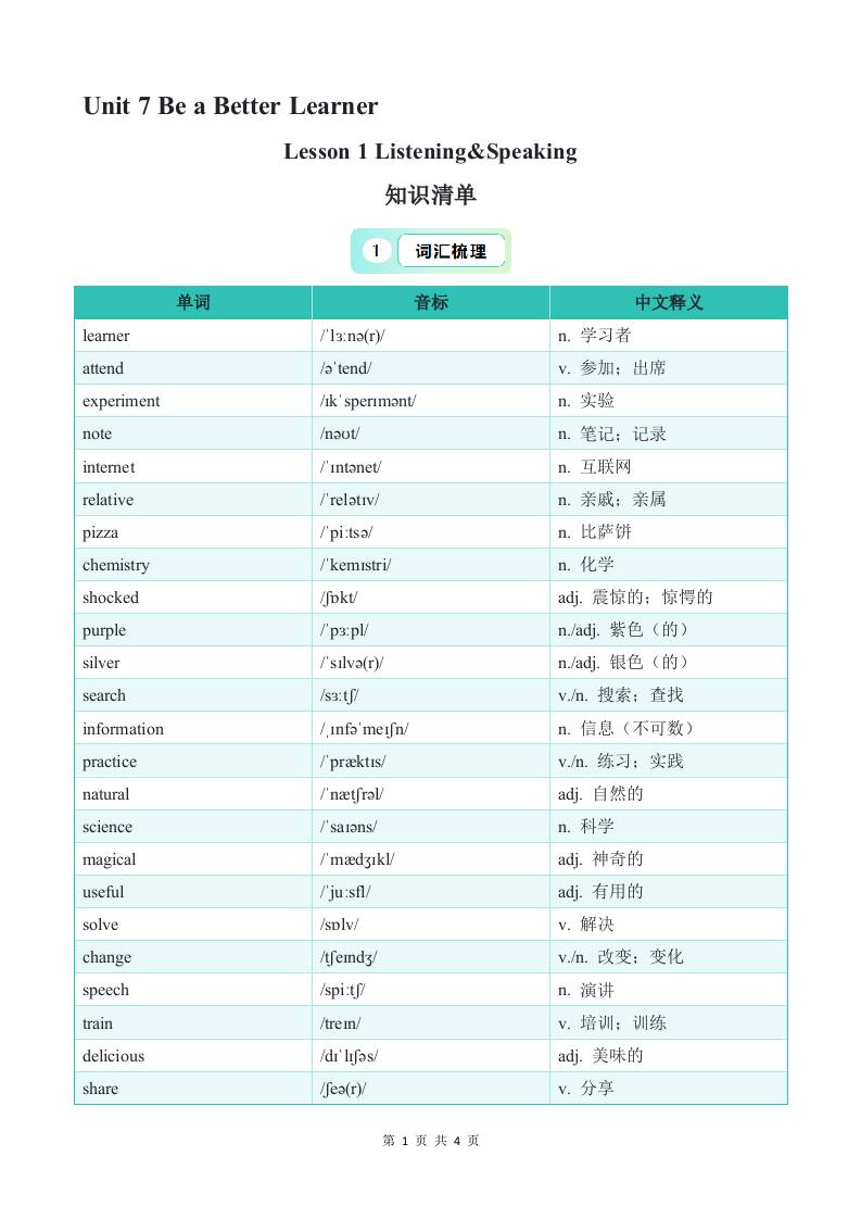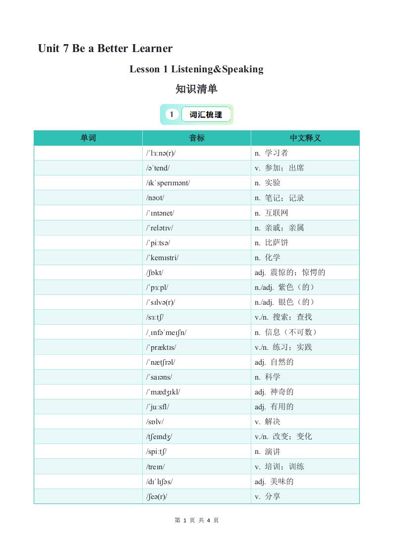 Unit 7 Lesson 1 Listening&Speaking 知识清单(默写版)