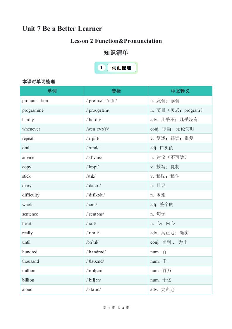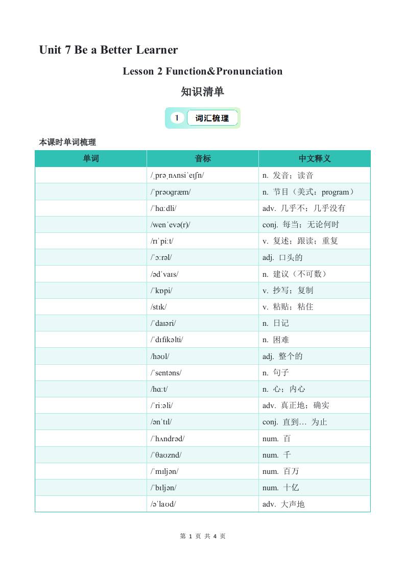 Unit 7 Lesson 2 Function&Pronunciation 知识清单(默写版)
