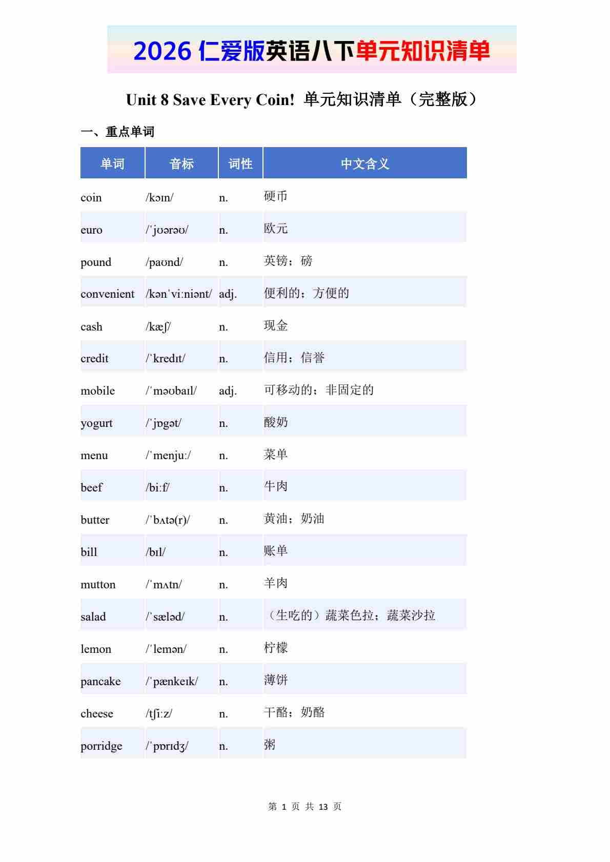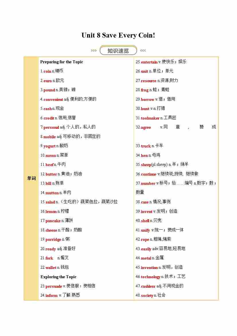Unit 8 Save Every Coin!(知识清单)(答案版)