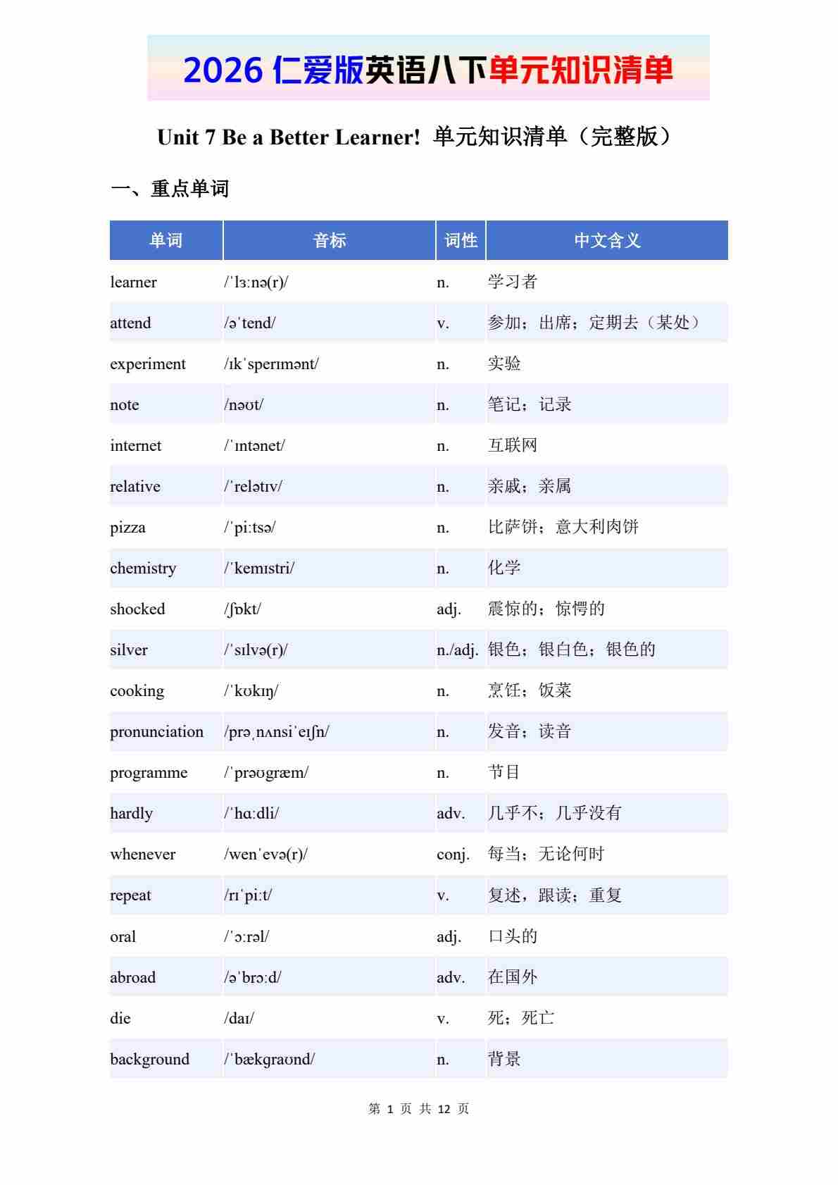 2026仁爱版英语八下单元知识清单 Unit 7
